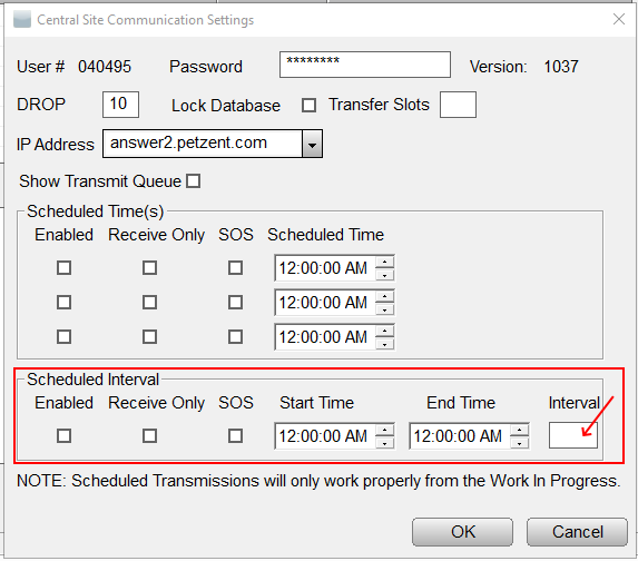 SOS and Interval Box work together. If the program is to send copies of archived returns at a specific interval, check the SOS box and set a time no less than 5 minutes in the Interval Box.Â