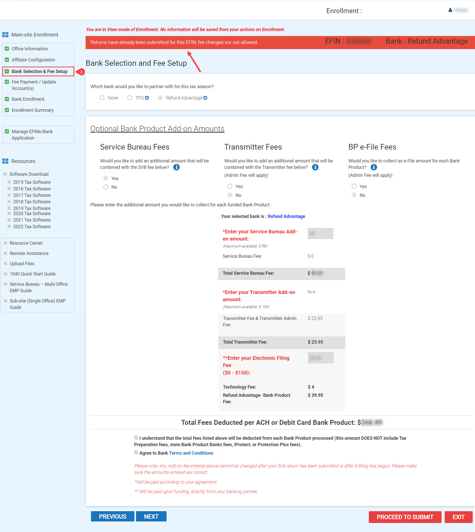 - Enter the Add-On Amount you wish to collect for each funded bank product. Admin Fees may apply. Note:Â Fee changes are not allowed once returns are filed.
