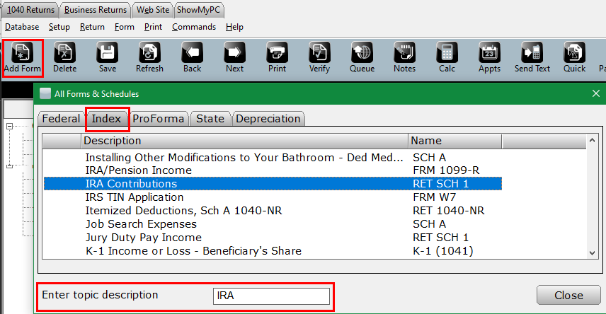 - Double click IRA Contributions (RET SCH 1) to add form to returnÂ