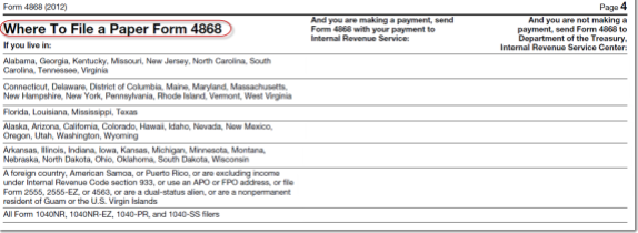 4. Scroll down in the PDF until you see Where To File a Paper Form 4868.