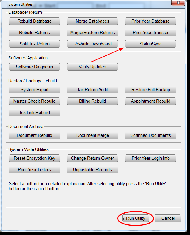- In the System Utilities window, click the StatusSync Button, then click Run Utility.