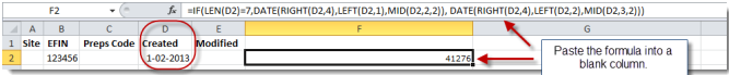 3. Copy and paste the formula into an empty column in Excel. The formula is set up to convert dates from column D starting on row 2. If the date is in a different column or you are starting with a different row, you will need to modify the variables.