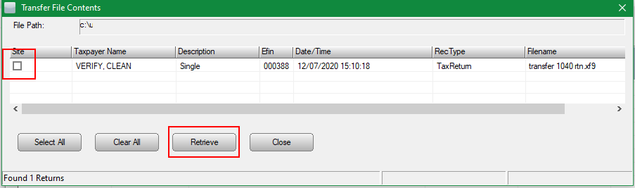 - Select the return(s) to be retrieved by checking the box in the "site" column or click the Select All button. Once returns are selected click Retrieve to import returns into the tax software.