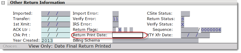 1. On a return that has been printed, there will be a Return Print Date on the Information and Status screen under Other Return Information. If the field is blank, the return has not been printed through print final return.The return has been printed and accepted.