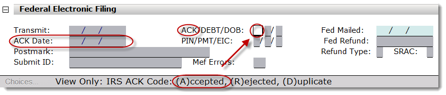 2. On a return that has been accepted, there will be an ACK code of A as well as an ACK Date on the Information and Status screen under Federal Electronic Filing.