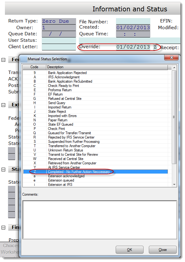 The return status can by overridden by pressing CTRL-Z and selecting a status. Z will set the status to "Completed." The override shows on the Information and Status screen.
