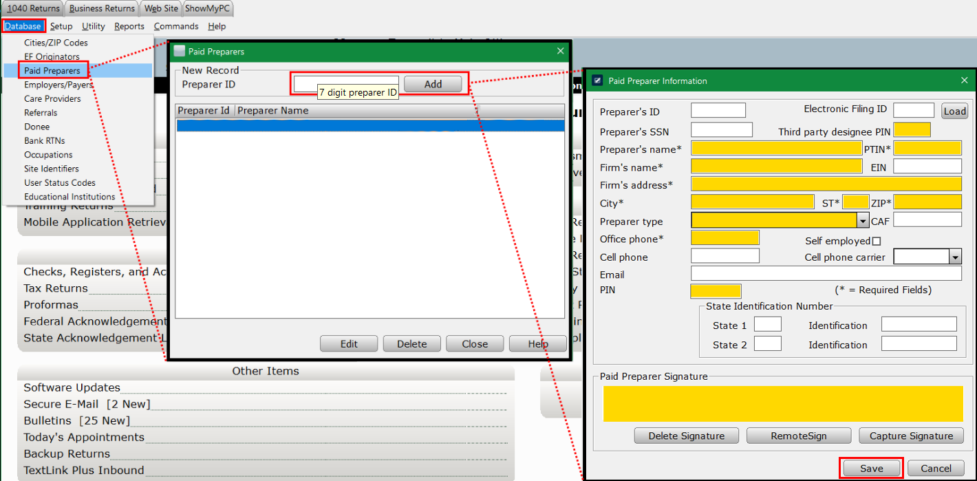 - Selecting Add will prompt the data entry location for that Preparer (Suggested highlighted areas below).