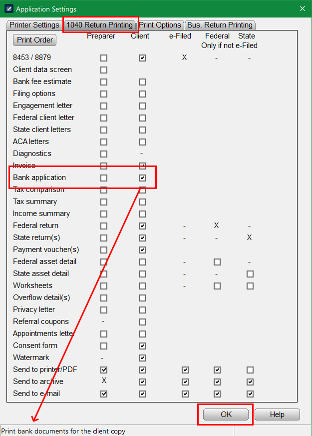 - Apply check mark for Bank Application under the appropriate printer package (IE: Preparer or Client).