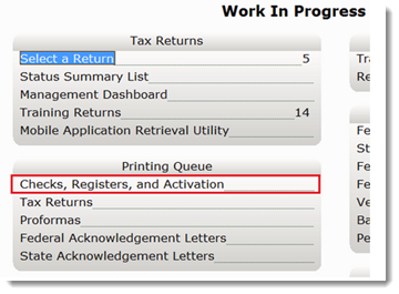 - From the Work In Progress screen, in the Printing Queue panel, click Checks, Registers and Activation.