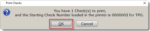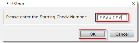 - If printing a single check, type the check number in the box indicated below. If printing multiple checks, enter the lowest check number. Click OK to continue.