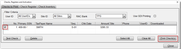 - Place a check mark next to the check(s) to be printed and then click the Print Check(s)Â Button.