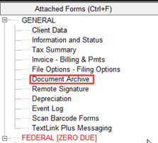 - Open the return and on the attached forms list on the left-hand side click on Document Archive.