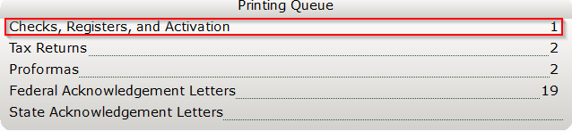 - From the Work In Progress screen, in the Printing Queue panel, click Checks, Registers and Activation.